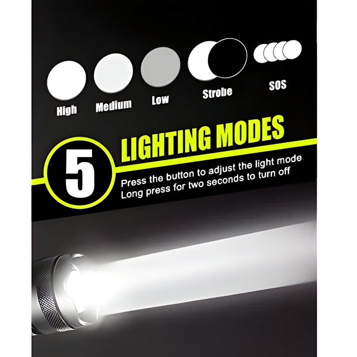 Diseñada para satisfacer todas tus necesidades, nuestra linterna ofrece una variedad de modos de iluminación para adaptarse a cada situación: 💡 alto brillo, 🔅 bajo brillo, 🎇 modo estroboscópico, modo S.O.S y un zoom ajustable para enfocar la luz donde más la necesites. 🌟